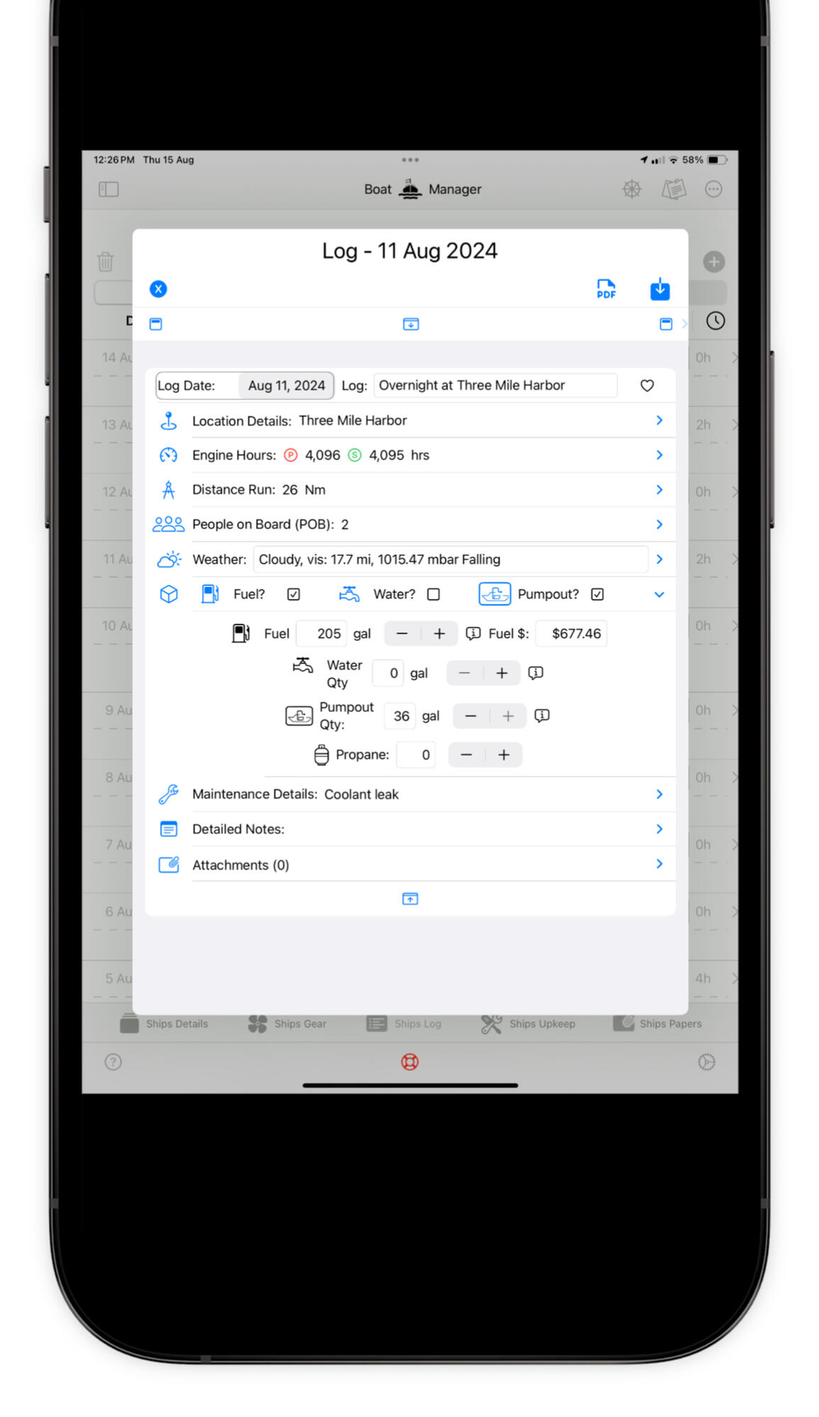 A popover dashboard, ‘the Helm’, showing where you are, the last log entry, key upcoming dates for the default boat and gauges for engine hours, fuel, water and holding tank.