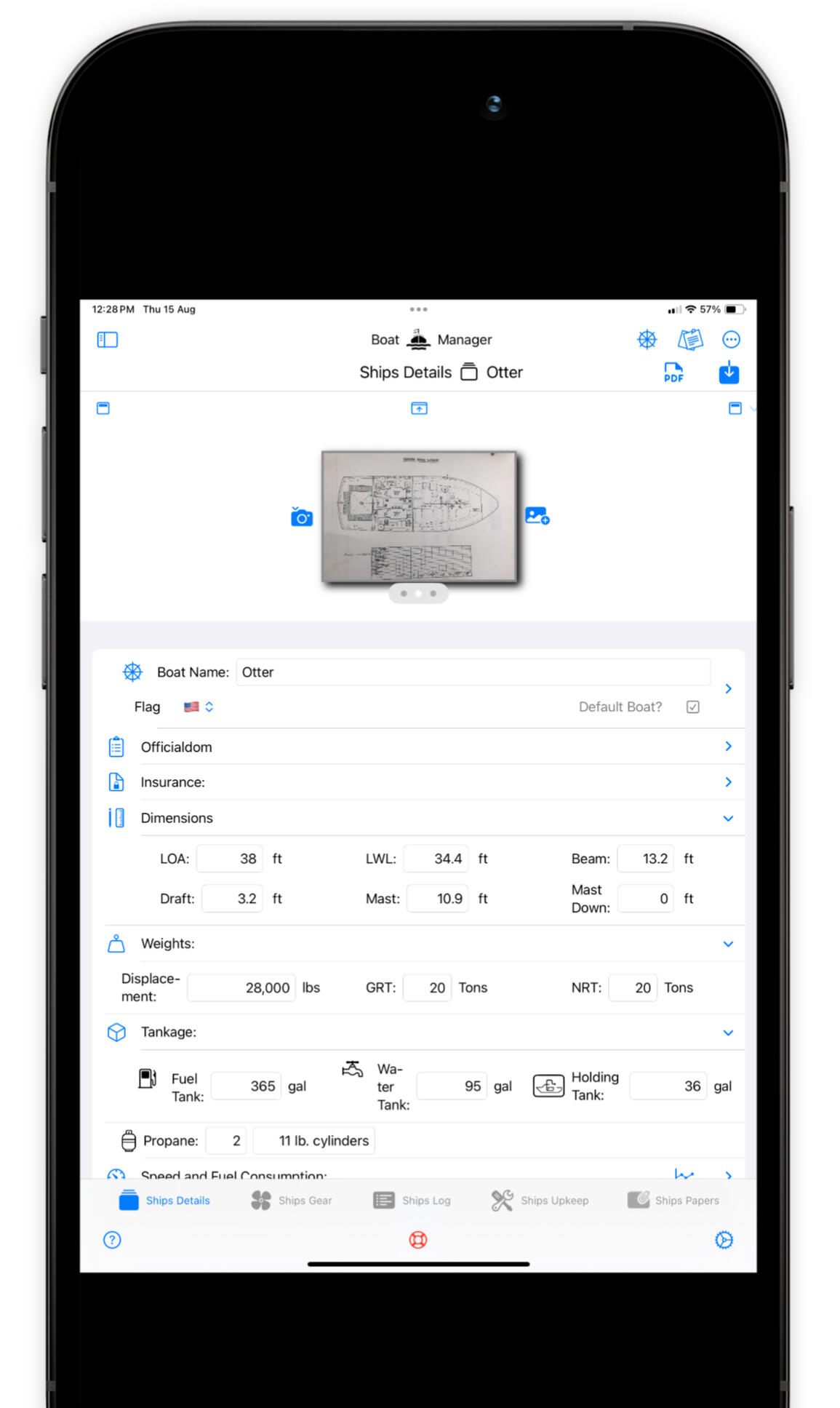 Documents (files, photos, videos) can be attached to each boat, ships log, ships equipment, spare parts inventory, crew member, waypoint or To Do item/note.