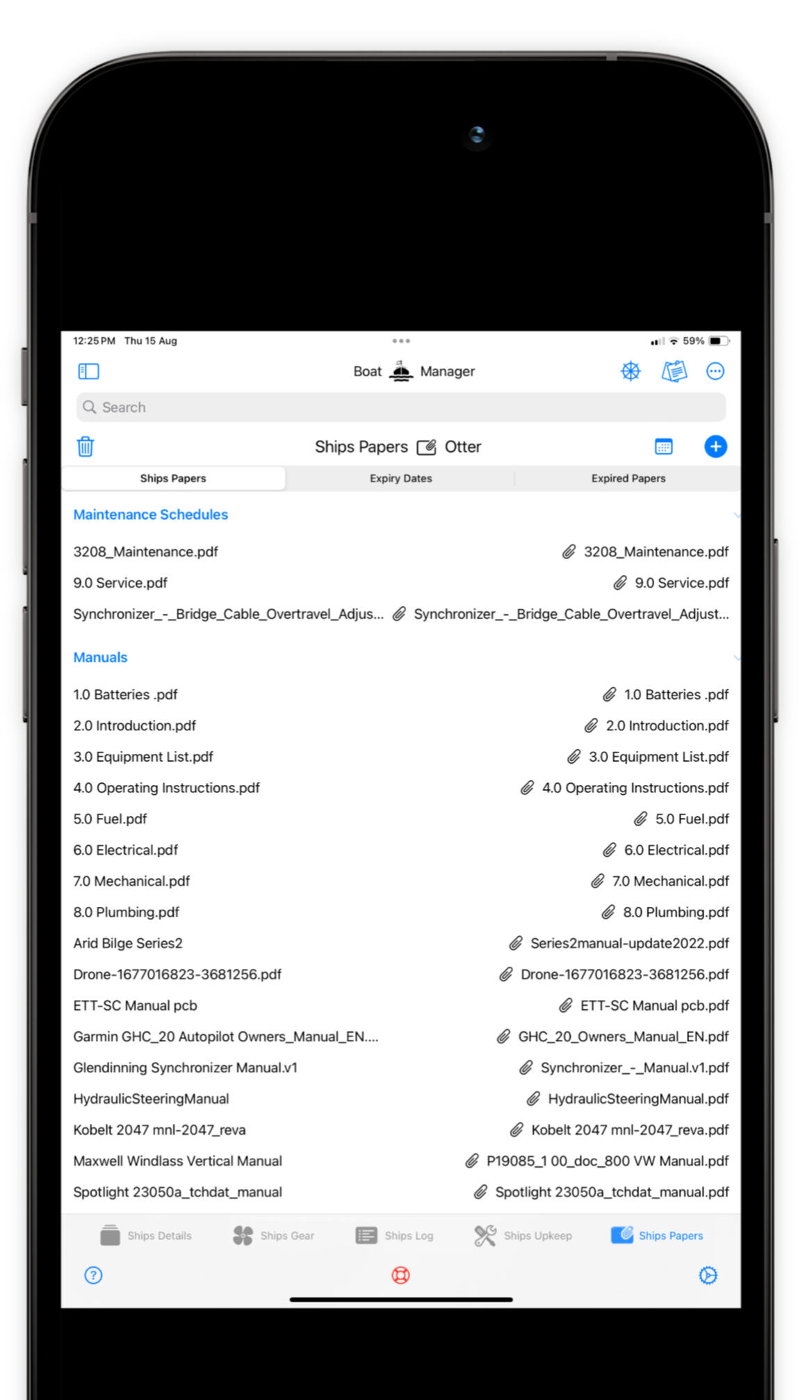 Expiry Dates for documents (for things like insurance policies), equipment (for things like fire systems or PLBs) and spare parts (for things like flares), each with an optional Apple Calendar reminder.
