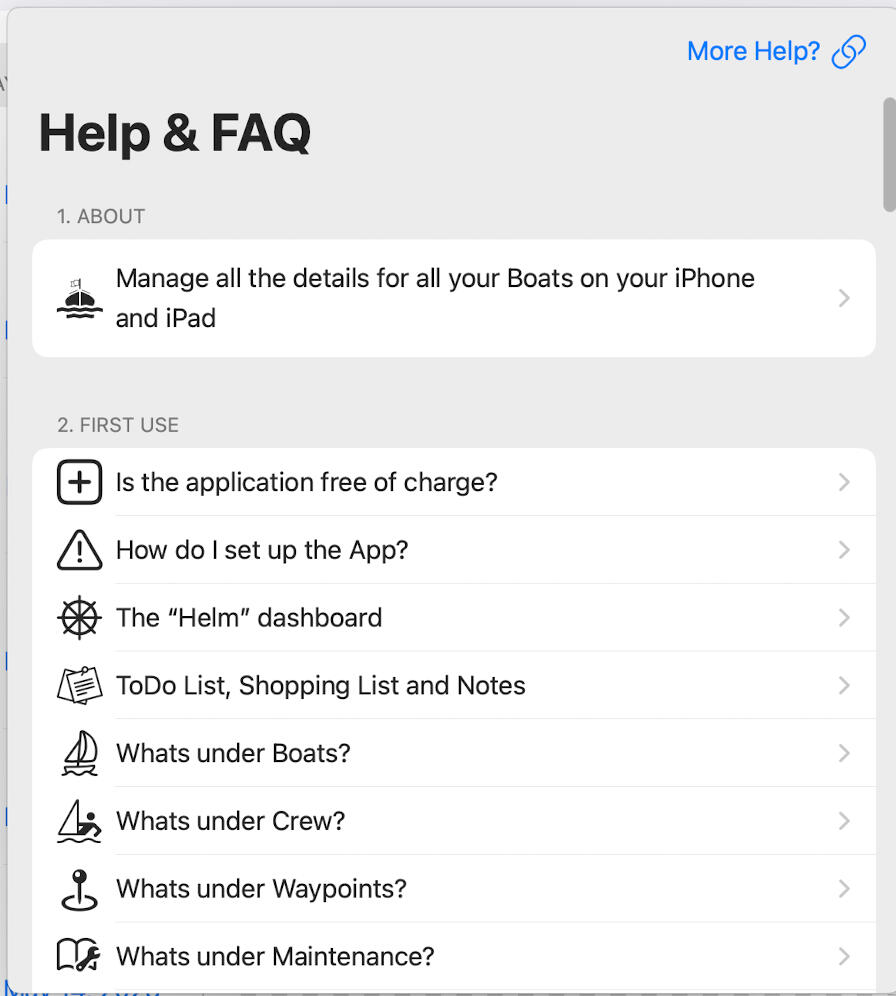 Boat Manager includes comprehensive Help/FAQ in the App. Tap on the ? in the top right corner.