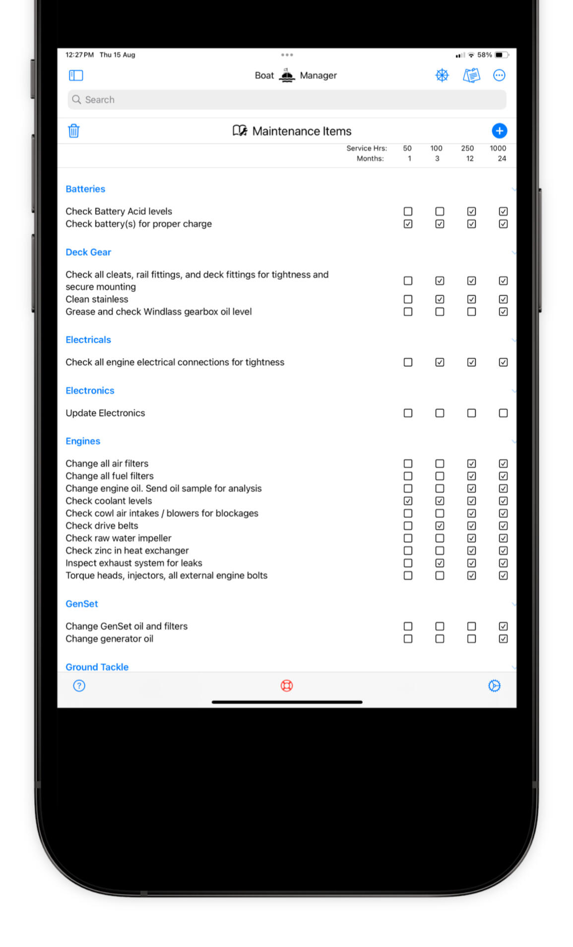 A database of recommended Planned Maintenance tasks and intervals, which can be added to a boat specific Upkeep Logbook.
